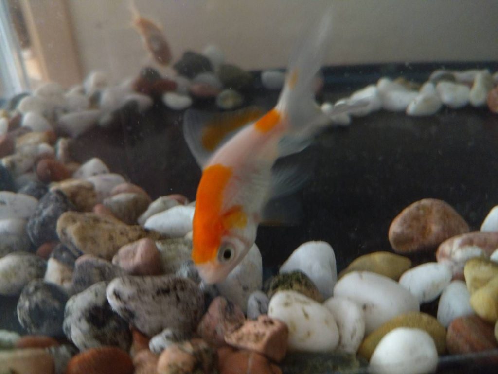 赤と白の混色金魚(名前は「ぴぃ」):頭の黒いもようがチャームポイント。