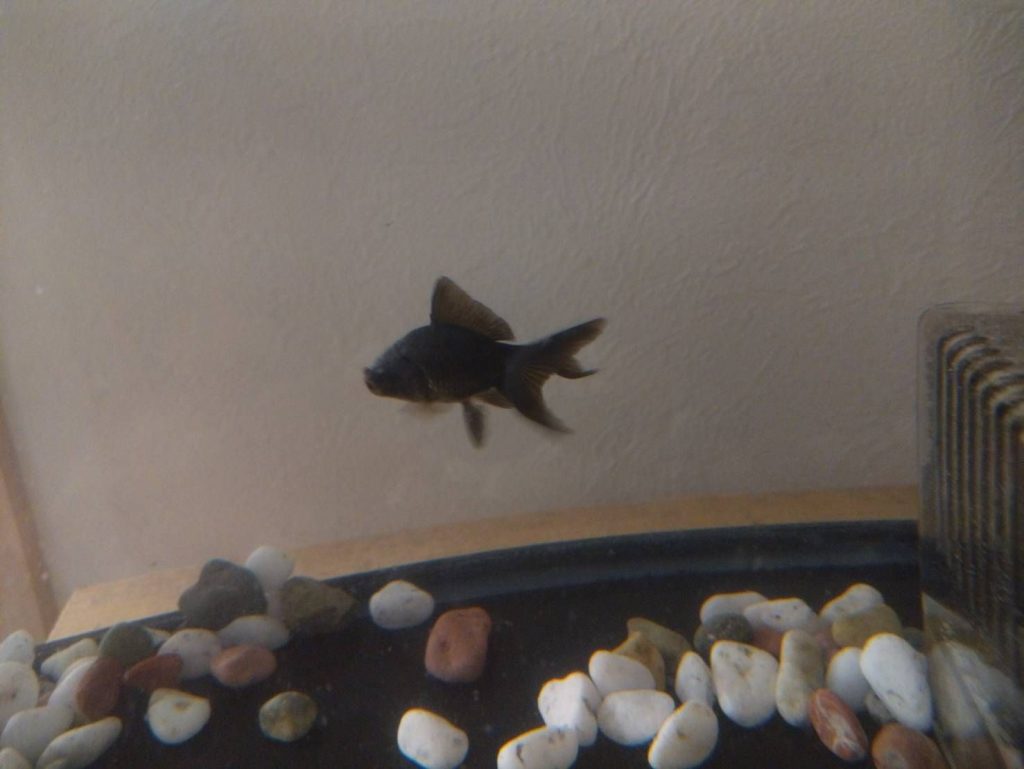 黒い金魚(名前は「くろぽん」):…でめきん。